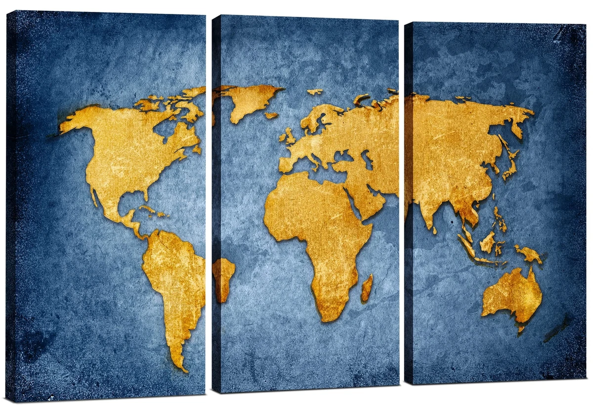 World Map Wall Art Decor Blue & Gold Travel Canvas Art Large 3