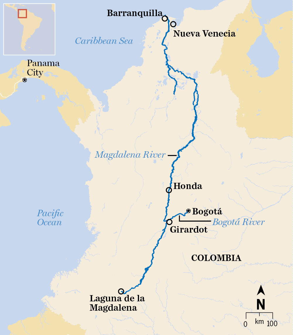 Map showing the course of the Magdalena River, plus other