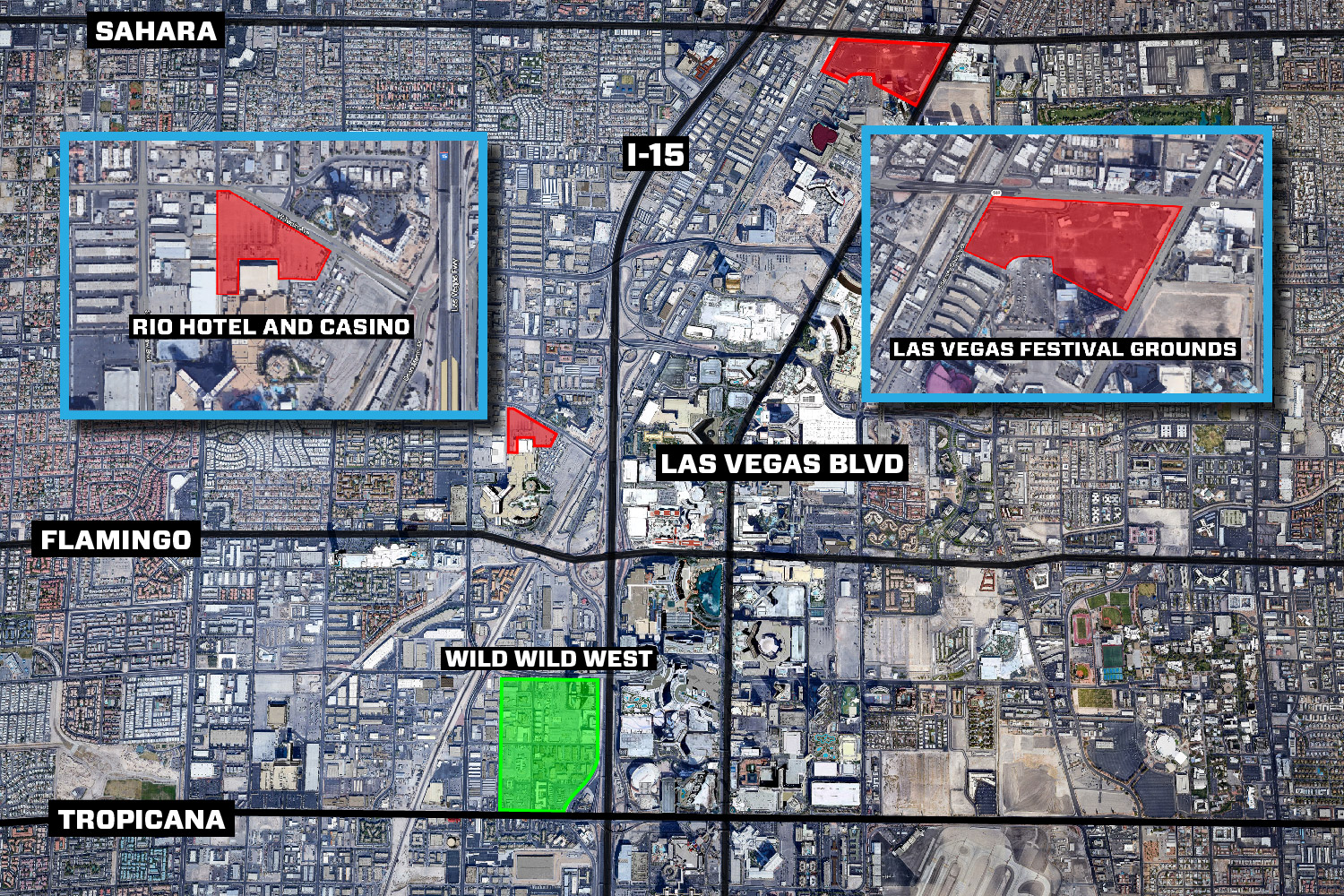 Las Vegas map Strip hotels graphical satellite overview showing